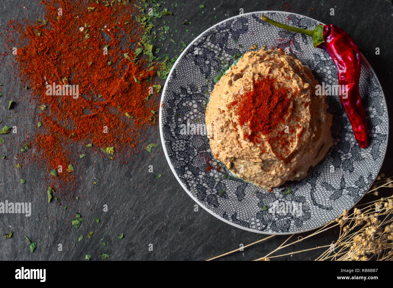 Delicious Spicy Hummus With Red Chilli Peppers And Spices Indian Recipe Dark Presentation On Textured Black Background With Some Ingredients Stock Photo Alamy